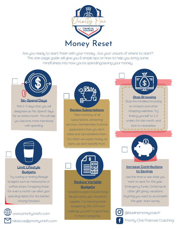 Are you ready to start fresh with your money, but you're unsure of where to start? This one-page guide will give you 6 simple tips on how to help bring some mindfulness to how you're spending/saving your money.